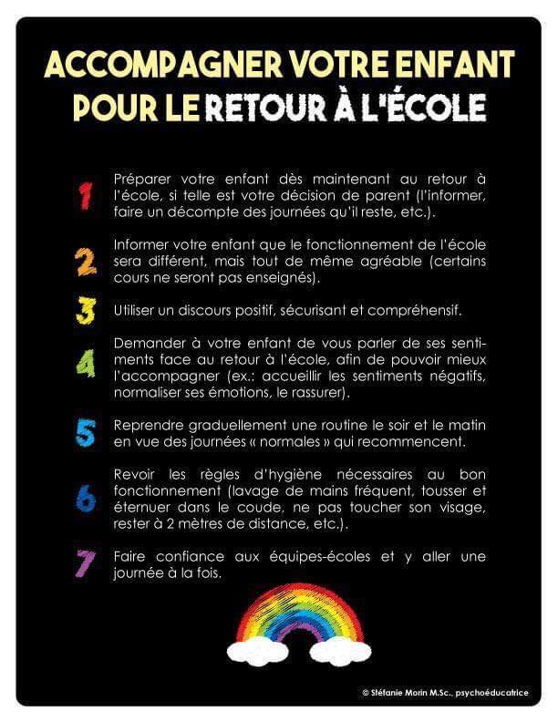 Voici le plan de travail que nous vous proposons cette semaine. Nous vous invitons également à parler avec votre enfant de son retour à l’école. Dès la semaine prochaine, monsieur Christian publiera des capsules pour vous faire visiter l’école et vous renseigner sur les différentes procédures à respecter. En pièces jointes, en plus du plan de travail, nous vous proposons un document conçu par une psychoéducatrice mentionnant 7 conseils pour accompagner votre enfant dans son retour à l’école. La semaine prochaine, nous animerons une visioconférence en direct de notre classe pour présenter ce nouvel espace aux enfants et pour répondre à leurs questions. Vos enfants pourront utiliser le même lien de connexion qu’à l’habitude. Sachez que nous sommes toujours disponibles pour vous alors n’hésitez pas à nous écrire via le pluriportail.
